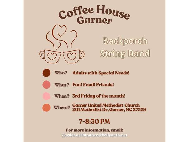 Garner UMC will be hosts a monthly social event for adult with special needs . This "Coffeehouse" gathering offers social interaction for people with all abilities in our community. On the 3rd Friday of each month, the Christian Life Center will be transformed into a coffeehouse with music, light refreshments and fellowship in a safe and inclusive environment. This event is open to anyone in the community to participate or volunteer! If you have any questions, contact Katie Cardenas (919-219-1613) or Tracey Singleton (919-880-3167). We continue to seek volunteers to work the event as well as items needed for the event.