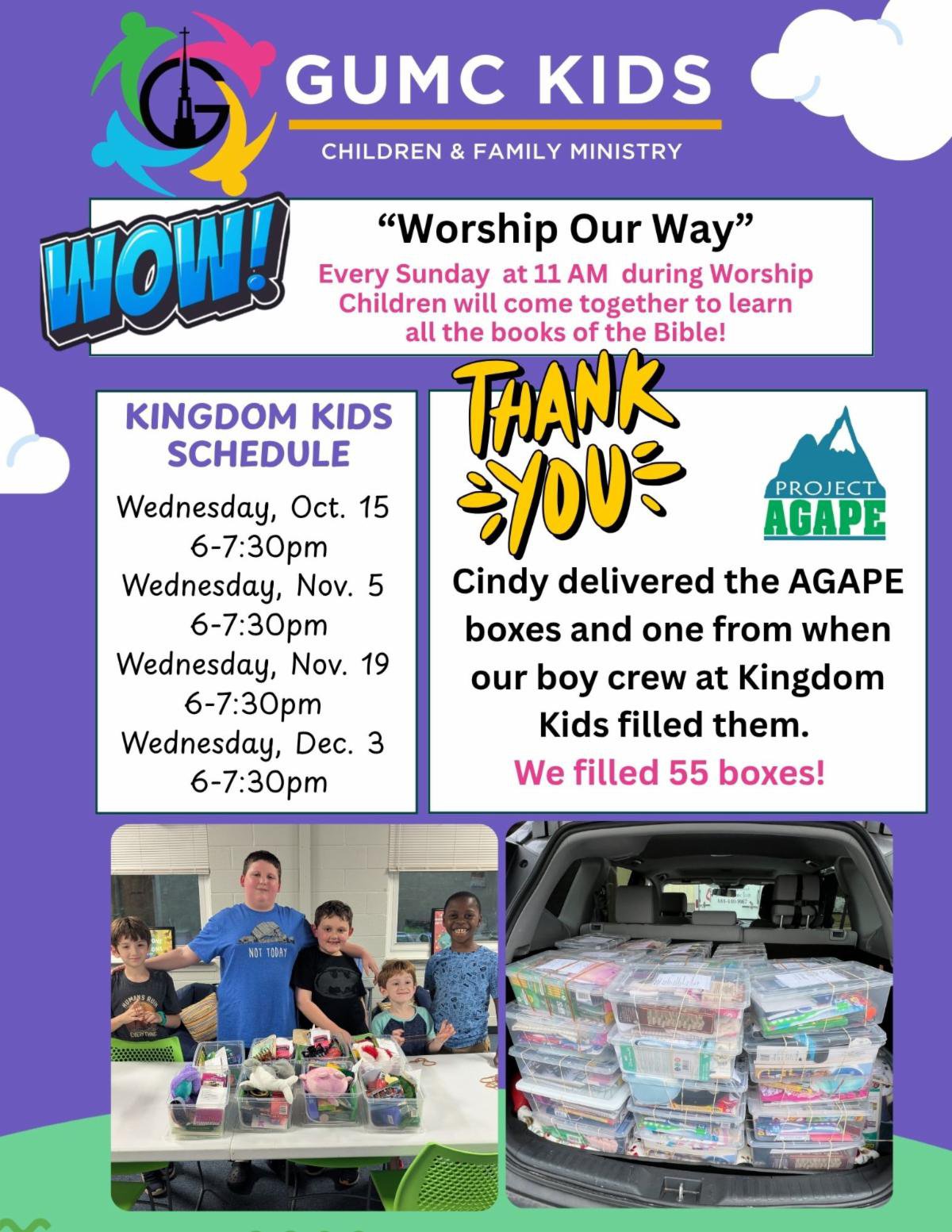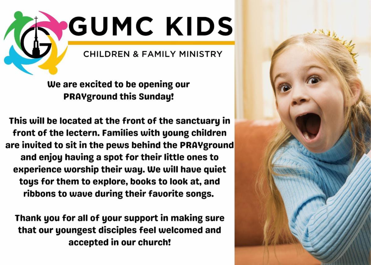 Welcome to GUMC Children & Family Ministries! Your child’s spiritual formation is very important to us! We are committed to partnering with families to establish and nurture young disciples so that their knowledge and love of Christ grows into a mature faith. Our goal is to provide safe, age appropriate, inviting and meaningful experiences that will accomplish these things in their lives.
